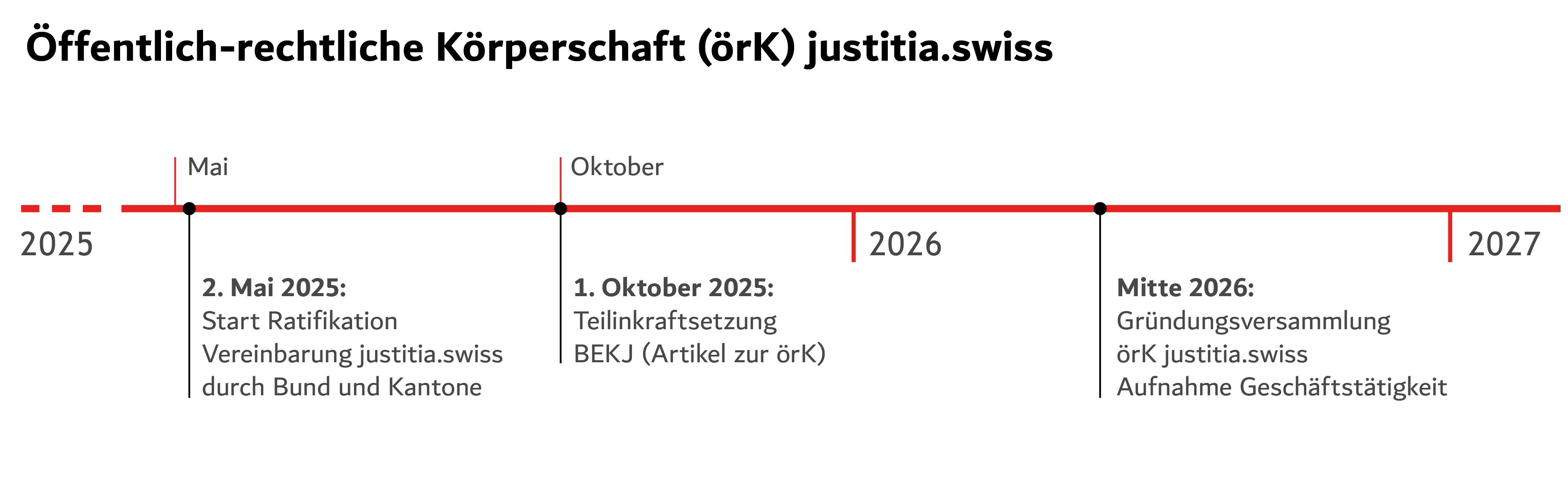 Die öffentlich-rechtliche Körperschaft justitia.swiss wird die Plattform justitia.swiss aufbauen, betreiben und weiterentwickeln. Bei Bedarf bietet sie spezifische zusätzliche Dienstleistungen und technische Mittel für die elektronische Kommunikation in Justizverfahren an. Die gesetzliche Grundlage für die Errichtung der öffentlich-rechtlichen Körperschaft liefert das Bundesgesetz über die Plattformen für die elektronische Kommunikation in der Justiz (BEKJ). Die Körperschaft nimmt ihre Tätigkeit auf, sobald der erste Teil des BEKJ (namentlich Art. 3 bis 17 BEKJ) in Kraft ist und der Bund sowie mindestens 18 Kantone die Vereinbarung justitia.swiss (Gründungsvereinbarung) ratifiziert haben. Dieser Zeitpunkt wird frühestens Mitte 2026 sein.