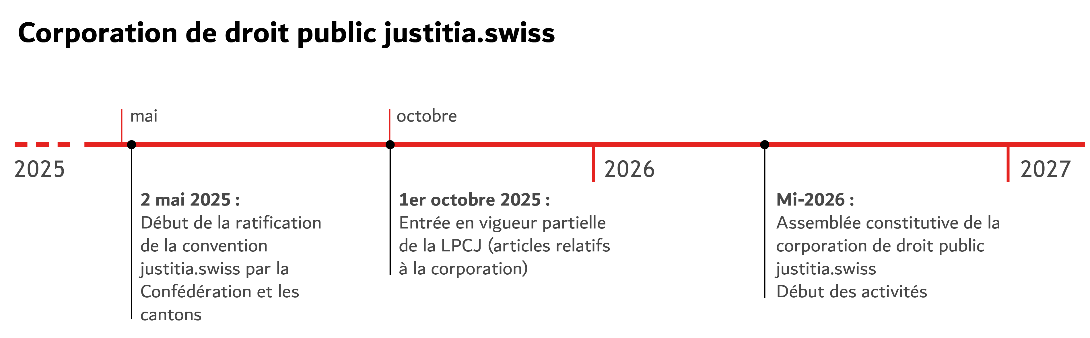 La convention justitia.swiss est l'acte fondateur de la corporation de droit public justitia.swiss. La Conférence des directrices et directeurs des départements cantonaux de justice et police (CCDJP l'a approuvée lors de son assemblée de printemps du 2 mai 2025 en vue de sa ratification par les cantons et la Confédération. L'assemblée constitutive pourrait donc avoir lieu à partir de mi-2026 environ, dès que 18 cantons et la Confédération auront ratifié la convention.