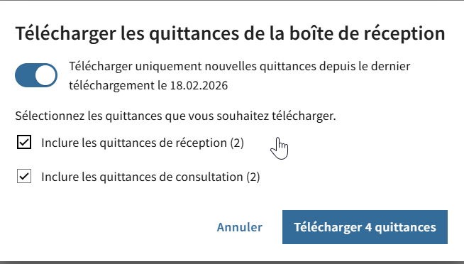 Les utilisatrices et utilisateurs peuvent utiliser la fonction « Télécharger les quittances» pour choisir les quittances qu'ils souhaitent télécharger localement. Le choix a été étendu à : « quittances de réception» et/ou «quittances de consultation ».