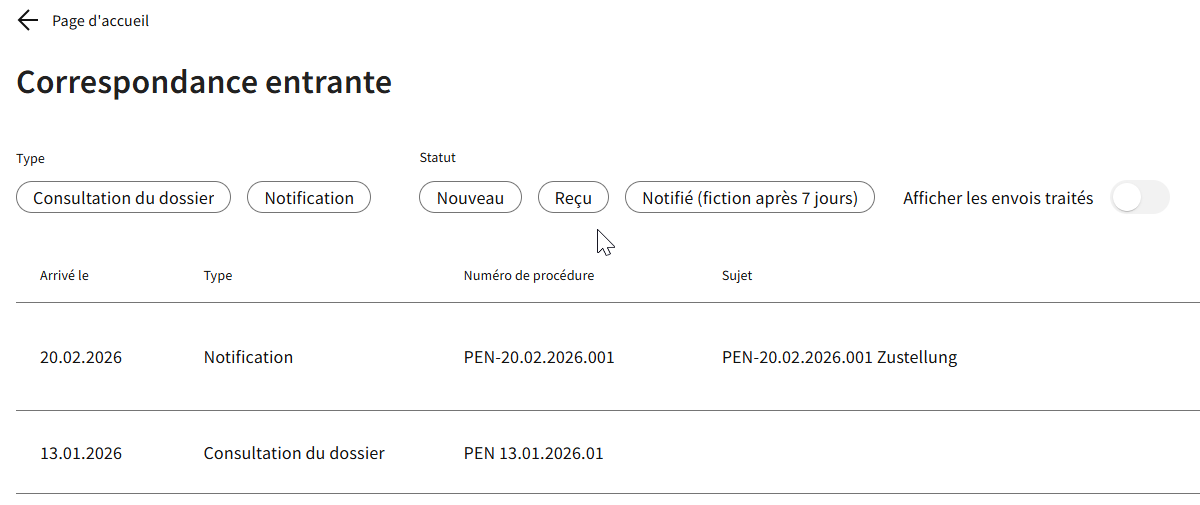 Sur la page « Correspondance entrante », il est désormais possible de filtrer les envois non seulement par type (communication, consultation de dossier et notification), mais aussi par statut : « Nouveau », « Reçu » et « Notifié (fiction après 7 jours)». De plus, le bouton radio « afficher les envois traités » permet d'afficher / cacher les envois marqués comme traités (petite coche verte). Par défaut, les envois marqués comme traités ne sont pas affichés.
